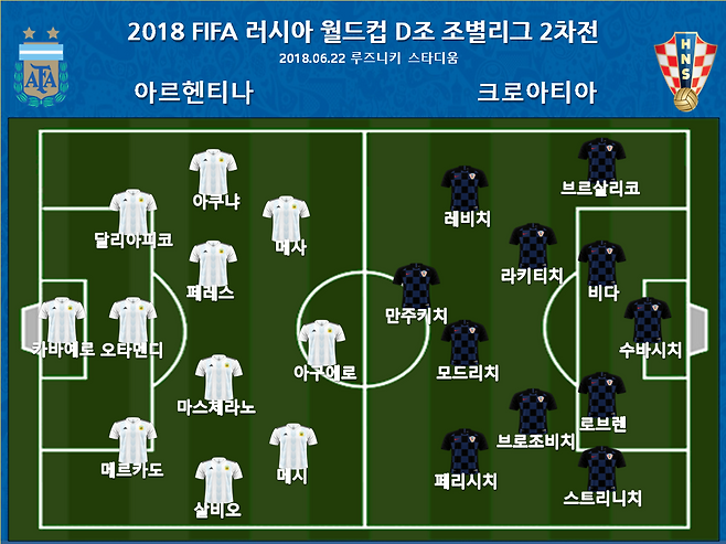 크로아티아는 22일 오전 3시(이하 한국시간) 러시아 니즈니 노브고로드 스타디움에서 열린 아르헨티나와의 2018 국제축구연맹(FIFA) 러시아 월드컵 D조 조별리그 2차전 경기에서 3-0으로 승리했다. 이로써 크로아티아는 승점 6점으로 16강 진출을 확정지었고, 반면 첫 승 사냥에 실패한 아르헨티나는 16강에 적신호가 켜졌다.