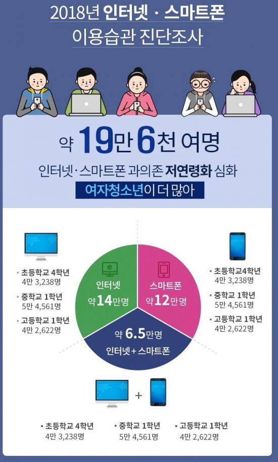조사 결과 올해 인터넷과 스마트폰 중 하나 이상에서 위험군으로 진단된 청소년은 약 19만6000여명으로, 이 중 두 가지 문제를 모두 갖고 있는 청소년(중복위험군)는 6만5000여명으로 나타났다.