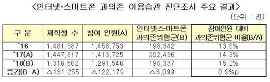 22일 여성가족부가 전국 초등학교 4학년과 중학교 1학년, 고등학교 1학년 등 학령전환기 청소년 129만여명을 대상으로 실시한 '2018년 인터넷·스마트폰 이용습관 진단조사'에 따르면, 인터넷·스마트폰에 과의존하고 있는 위험군 학생의 비중이 지난 2016년 13.6%(19만8642명)에서 2017년 14.3%(20만2436명), 올해는 15.2%(19만6337명)로 꾸준히 증가하는 것으로 나타났다.