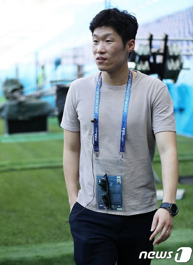 (로스토프나도누(러시아)=뉴스1) 오대일 기자 = 박지성 해설위원이 2018 러시아월드컵 한국과 멕시코의 조별리그 2차전을 하루 앞둔 22일 오후(현지시간) 러시아 로스토프 아레나에서 열린 축구대표팀 공식 훈련을 찾아 후배들을 격려하고 있다. 1차전 패배로 벼랑끝에 몰린 신태용호는 오는 23일 로스토프 아레나에서 중남미 강호 멕시코와 물러설 수 없는 일전을 치른다. 2018.6.22/뉴스1