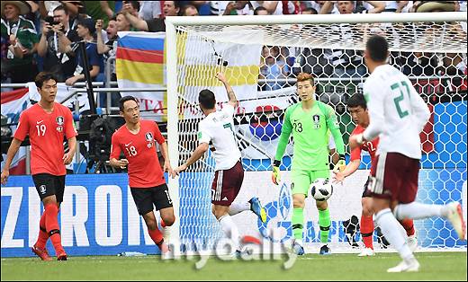 [마이데일리 = 로스토프(러시아) 김성진 기자] 축구대표팀 선수들이 24일 새벽(한국시각) 러시아 로스토프 아레나에서 진행된 '2018 러시아월드컵' 대한민국 vs 멕시코의 F조 조별예선 2차전 경기에서 전반26분 멕시코 벨라에게 PK골을 허용한 뒤 아쉬워 하고 있다.