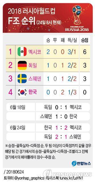 [그래픽] 2018 러시아월드컵 F조 순위 (24일 현재)