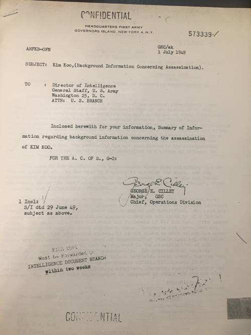 이 문서는 1948년 12월까지 CIC에 근무했던 조지 E. 실리 소령이 본국에서 1949년 6월 백범 암살 직후 작성해 미육군정보국에 제출한 A4용지 5장 분량의 보고서로, 3급비밀 문건이다. 그는 보고서에서 “안두희는 한국주재 CIC 정보원으로, 암살 명령을 내리면 누구든 죽이겠다는 피의 맹세를 했다”면서 “김구는 공산주의자들과 결탁했으며, 한국에서 명망높은 정치인이었다”고 기록했다.