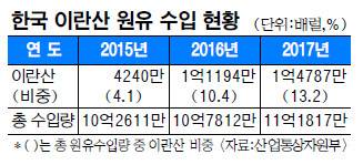 한국석유공사에 따르면 지난해 국내에 들어온 이란산 원유량은 1억4787만 배럴로 전년 대비 32.1% 늘었다. 이란산 원유가 다른 국가 원유보다 배럴당 5∼6달러 싼 편이라 지난해 사우디아라비아 쿠웨이트 다음으로 수입 물량이 많았다. 업계에선 국내 정유사들이 중동산 석유 편중에서 벗어나 미국 등 수입선을 다변화해 원유 수급에 어려움이 없을 것으로 보고 있다.