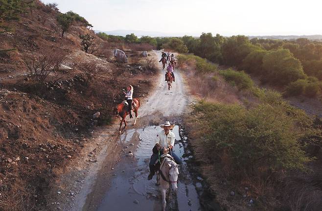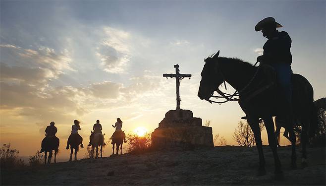 나무로 만든 십자가가 있는 언덕에 오르자 기다리기라도 한 듯 노을이 졌다. 동그랗고 빨간 해가 쏙 떨어졌다. 로드리고는 우리를 이리 세웠다 저리 세웠다 하며 멋진 인증 샷을 남겨 주었고, 돌바닥 길 위에서 또각거리는 말발굽 소리를 들으며 다시 도시로 내려왔다. 노란 가로등에 잠긴 소박한 집들은 운치가 더 넘쳤다. 30분 정도 말을 타고 가다, 오래된 칸티나에 들러 데킬라를 한 잔 들이켰다. 그리고 다시 말을 타고 산 미겔 교회가 있는 광장에 다다르자 어디선가 마리아치(Mariachi)* 밴드가 나오더니 우리들 말 앞에서 열심히 멕시코 전통노래를 불렀다. 시내에서 말을 타고 다니는 사람은 없기에(더구나 이 밤에) 우리는 순식간에 사람들로 둘러싸였고, 사진과 동영상 세례를 받았다. 우리가 지나갈 때마다 휘파람을 불고 박수를 쳐 주던 사람들에게 그웬이 열심히 말을 걸었다.