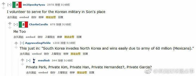 몬테레이 뿐 아니라, 인터넷 세상도 온통 난리가 났습니다. "내가 손흥민 대신 군대가겠다"라는 멕시코팬이 인터넷에 올린 글이 퍼지고 퍼져 중국까지 건너갈 정도로!