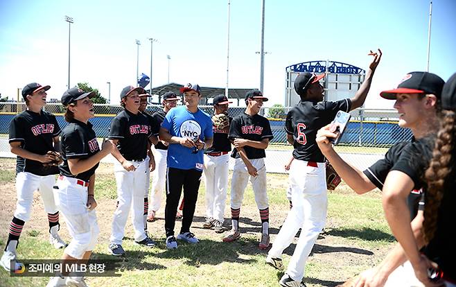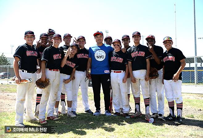 이렇게 찍게 된 추신수와 outlaws 선수들의 기념사진. 10년 후에 이 사진에 있는 아이들 중 몇 명이 메이저리그에서 뛰고 있을지도 모릅니다. 그리고 메이저리거가 돼 가장 기억에 남는 순간을 이날로 꼽을지도 모릅니다. ‘기적 같은 하루였다’면서 말이죠.