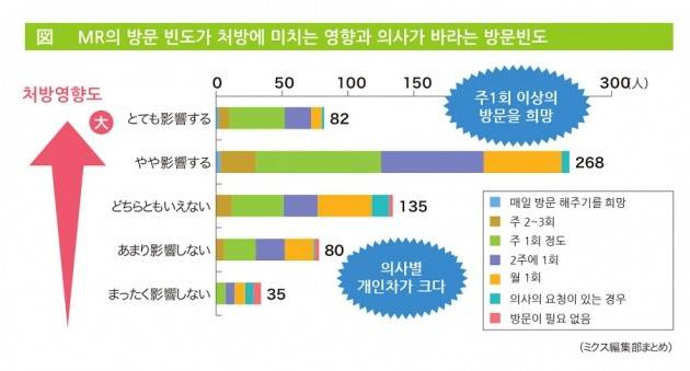 더욱이 B컨설팅사가 일본의 의사들에게 실시한 설문조사에서 MR의 콜 빈도 수에 대한 의사들의 인식이 빈도 숫자를 늘리는 것이 매출액 향상과 상관관계가 낮다는 분석이 나왔다. 오히려 지금의 방문 수는 무의미한 방문이 많으며 절반 이하로 줄여도 문제가 없다는 의견이 많았다.