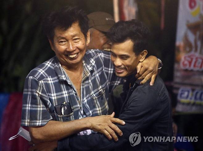 (매사이<태국> AP=연합뉴스) 2일(현지시간) 태국 북부 치앙라이 주 매사이 지구 탐루엉 동굴 안에서 실종됐던 유소년 축구팀 선수 12명과 코치 등 13명이 모두 무사한 상태로 발견됐다는 소식이 전해지자 실종자 가족들이 동굴 밖에서 서로 얼싸안으며 기뻐하고 있다. 이날 나롱싹 오소따나꼰 치앙라이 지사는 지난달 23일 훈련을 마치고 관광 목적으로 이 동굴에 들어간 뒤 연락이 끊긴 유소년 축구팀 선수들과 코치가 모두 살아있는 것으로 확인됐다고 전했다.