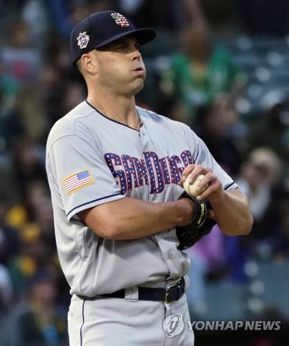 epa06862797 San Diego Padres starting pitcher Clayton Richard reacts after giving up an RBI single to Oakland Athletics Khris Davis during the sixth inning of their MLB game at the Oakland Coliseum in Oakland, California, USA, 03 July 2018. Richard gave up five runs in the inning. EPA/JOHN G. MABANGLO