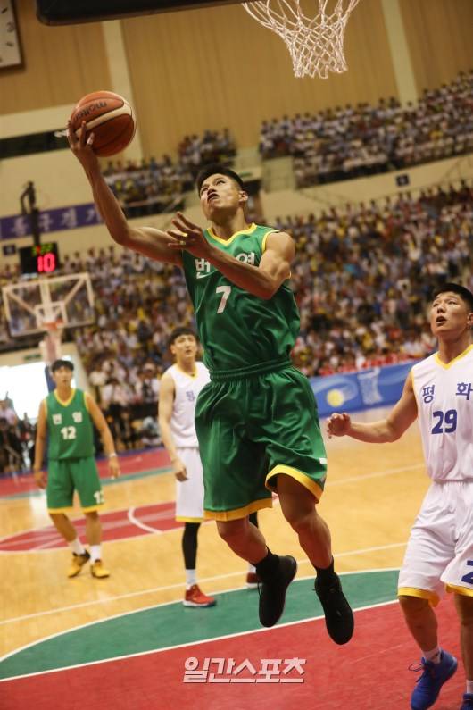 :4일 오후 평양 류경정주영체육관에서 개최된 남북통일농구경기에서 남자 ‘평화’팀과 ‘번영’팀 시합이 펼쳐지고 있다. 슛을 하는 선수는 북측 번영팀 최성호 선수.