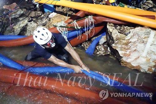 epa06863737 A handout photo made available by Thai Navy Seal on 04 July 2018 shows Thai Navy officer and rescuers work inside a cave complex during the ongoing rescue operations for the child soccer team and their assistant coach, at Tham Luang cave in Khun Nam Nang Non Forest Park, Chiang Rai province, Thailand. Rescuers are bringing supplies and foods into the cave, where the missing 12 boys and their assistant coach remain, as efforts to drain the cave have not been successful due to rainy weather. Operations are underway to safely bring out the youth soccer team out of the cave. Thirteen of a youth soccer team including their assistant coach were trapped in Tham Luang cave since 23 June 2018. EPA/THAI NAVY SEAL / HANDOUT ONLY WATERMARKED VERSION AVAILABLE HANDOUT EDITORIAL USE ONLY/NO SALES