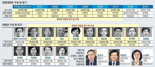 최근 김명수 대법원장이 신임 대법관 3명을 임명 제청한 것을 포함해 올해 안에 대법관 6명이 교체된다. 문재인 대통령 임기 내 대법원과 헌법재판소 인적 구성이 대거 바뀌면서 쏠림 현상을 우려하는 목소리도 나온다. 전문가들은 사법부 독립을 위해 인적 구성이 가장 중요한 만큼 대법관과 헌법재판관의 임기를 수정해 견제와 균형의 원칙을 바로 세워야 한다고 지적했다.