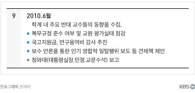 KBS 탐사보도부가 4일(어제) 공개한 국가정보원 문건에는 '학계 내 주요 반대 교수들의 동향을 수집하고, 복무규정 준수 여부 및 교원 평가실태 점검, 국고지원금, 연구용역비 감사 추진'이라고 적혀있다.