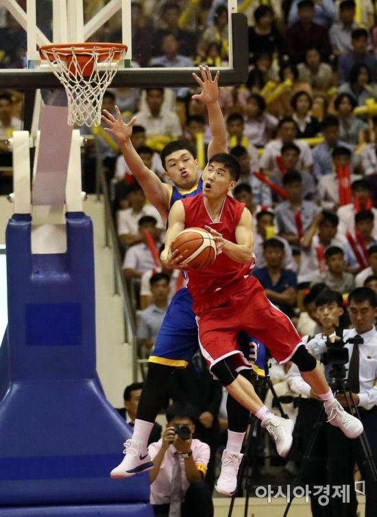 5일 오후 평양 류경정주영체육관에서 남북통일농구경기가 열렸다. 남측 이승현 선수가 북측 김청일 선수의 돌파를 막고 있다./사진공동취재단