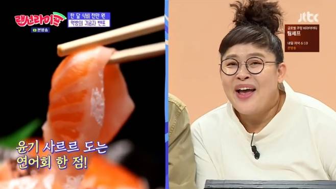 방송이 시작되고 밴쯔는 가장 먼저 애피타이저로 연어회를 먹었다. 특히 그는 한 점이 아닌 네 점을 집어 시원시원한 먹방을 선보였고, 이영자는 "먹방 신의 영역이다"며 감동해 웃음을 자아냈다.(사진=JTBC '랜선라이프' 캡처)