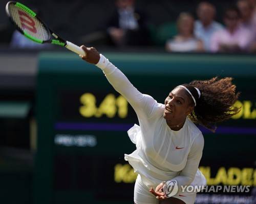 epa06868444 Serena Williams of USA serves to Kristina Mladenovic of France in their third round match during the Wimbledon Championships at the All England Lawn Tennis Club, in London, Britain, 06 July 2018. EPA/NIC BOTHMA EDITORIAL USE ONLY/NO COMMERCIAL SALES