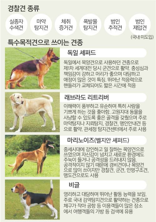 6일 경찰 등에 따르면 우리나라에 처음 경찰견이 등장한 것은 박정희정부 시절인 1973년이다. 유럽이나 미국에서 20세기 초부터 경찰견 훈련시설을 운용한 것에 비하면 비교적 늦었다.