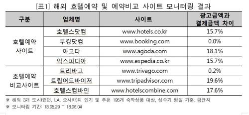 호텔스닷컴, 아고다, 익스피디아, 호텔스컴바인 등 해외 호텔예약 사이트에서 광고한 금액이 실제 결제금액과 큰 차이를 보이는 것으로 나타났다.