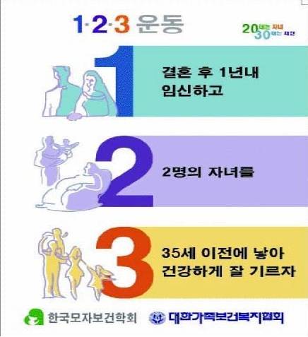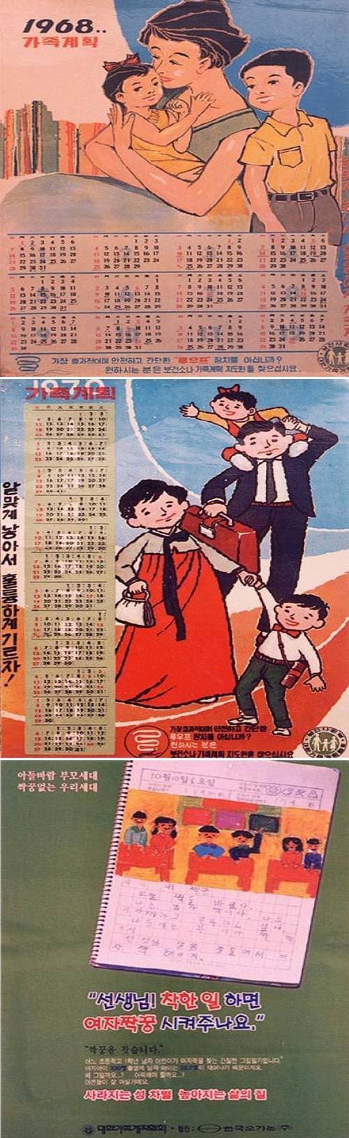 | 포스터로 살펴보는 인구정책 변화 1960년대에 ‘3·3·35운동(3명의 자녀를 3년 터울로 35세 이전에 단산하자)’으로 시작된 정부주도의 가족계획사업은 1986년 ‘하나 낳기 운동’으로 최고조에 달했다. 1990년대 포스터를 살펴보면 남아 선호로 인한 성비 불균형이 시급한 사안으로 급부상했음을 짐작할 수 있다. 다출산을 장려하는 정책은 2000년대에 이르러서야 비로소 등장했다. 자료: 보건복지부 |