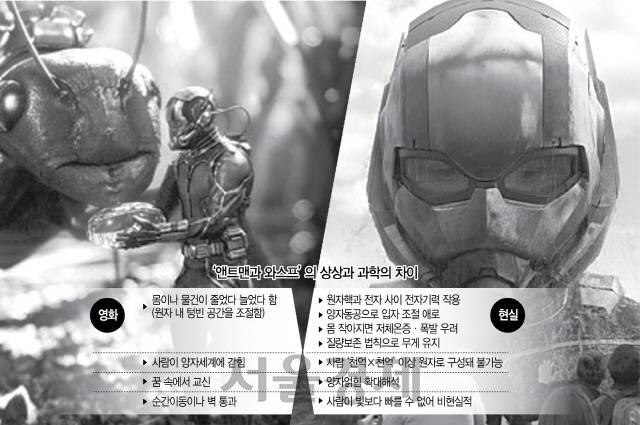 ‘김상욱의 양자공부’의 저자인 김상욱 경희대 물리학과 교수는 “전자는 파동을 갖고 원자핵과 전자 사이에는 전자기력이 작용해 단단한 구조를 이루며 만물이 형체를 유지하는데 파동의 크기는 정해져 있어 앤트맨의 설정은 비과학적”이라고 설명했다. 입자 간 거리를 한없이 줄일 수 있는 영화 속의 ‘핌 입자’라는 게 실존한다면 모르지만 현실에서는 다르다는 것이다.