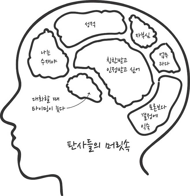대화라는 것은 말을 하고 싶어도 참고, 또 하고 싶지 않아도 하면서 의사를 섞는 것이다. 하지만 판사들은 상대방과 의사를 교환할 생각을 좀처럼 하지 않는다. 상대방의 얘기를 듣고 판단하는 것에 치중한다. 이런 성향은 토론이 필요한 상황에서야 드러난다. 헌법재판소 관계자들은 “판사들이 헌재에 연구관으로 파견 와서는 한동안 토론에 참여하지 못한다. 의견을 내고, 반박당하고, 재반박하는 것에 익숙하지 않은 것 같더라”고 했다. 법관 상대 강연에 나가본 사람들도 말한다. “표정의 변화가 없다. 가벼운 자리인데도 계속해서 평가받는 기분이 들게 한다.”