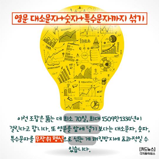 이런 조합은 뚫는 데 최소 70일, 최대 1509만1334년이 걸린다고 합니다. 또 영문을 앞에 넣기 보다는 대소문자, 숫자, 특수문자를 무작위 형식으로 섞는 게 해킹방지에 효과적일 수 있습니다.