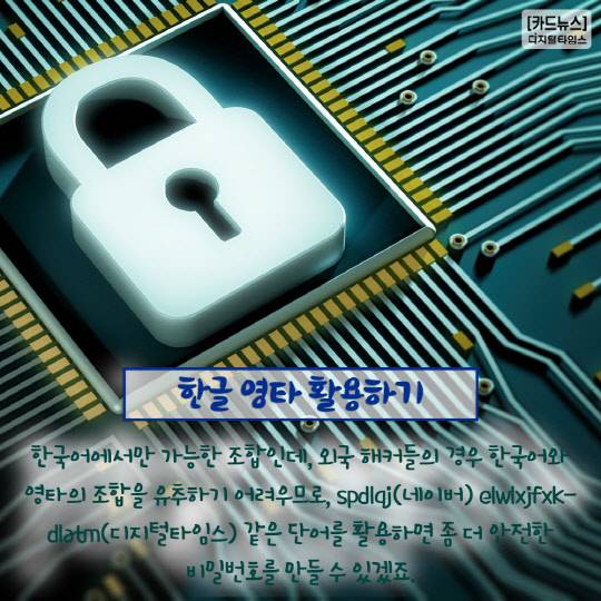 한국어에서만 가능한 조합인데, 외국 해커들의 경우 한국어와 영타의 조합을 유추하기 어려우므로, spdlqj(네이버) elwlxjfxkdlatm(디지털타임스) 같은 단어를 활용하면 좀 더 안전한 비밀번호를 만들 수 있겠죠.