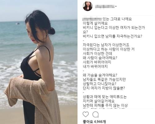 다음날 그는 "비키니 입는다고 이상한 여자가 되는 건가요? 비키니 입으면 남자를 자극하는 건가요?"라는 글을 올리며, 의문을 표했다.