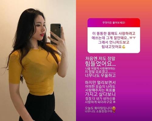 그는 "처음엔 저도 정말 힘들었어요. 나를 어떻게 사랑해야 하는지 정말 모르겠고, 우울하고. 하지만 어떠한 모습의 나라도 사랑해주자는 목표를 가지고 살다 보니 점점 더 내가 자신을 사랑하게 되더라고요. 오늘도 파이팅입니다"라고 했다.