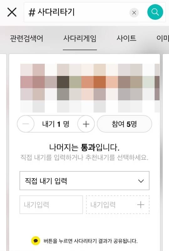 요즘에는 개인적으로 메시지를 주고 받는 것 보다 단체채팅방에서 다 함께 어울려 대화하는 일이 더 잦을 텐데요. 그러다보면 ‘내기’를 해야 하는 경우가 종종 있습니다. 예를 들어 커피 사기, 저녁 밥 사기 같은 거죠. 그럴 때 채팅방 하단 우측에 ‘#’라고 표시된 버튼을 누르고 ‘사다리타기’ ‘제비뽑기’ 등을 쳐보세요. 그럼 종이에 사다리를 그리거나 가위바위보를 통하지 않아도 알아서 척척 바로 내기가 시작됩니다.