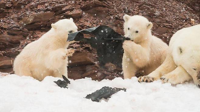 사진 속에서 두 마리의 아기 북극곰이 검은색 플라스틱 쓰레기를 뜯어 먹고 있습니다. 마치 먹이인양 두 발로 쓰레기를 꼭 잡은 채 한참을 씹어 먹습니다.