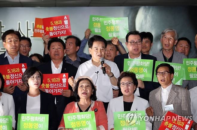 (광주=연합뉴스) 박철홍 기자 = 민주평화당 정동영 의원이 14일 오후 광주 동구 금남로공원에서 당 대표 출마를 공식 선언하며 지지자들과 '우리의 소원은 통일' 노래를 부르고 있다. 2018.7.14