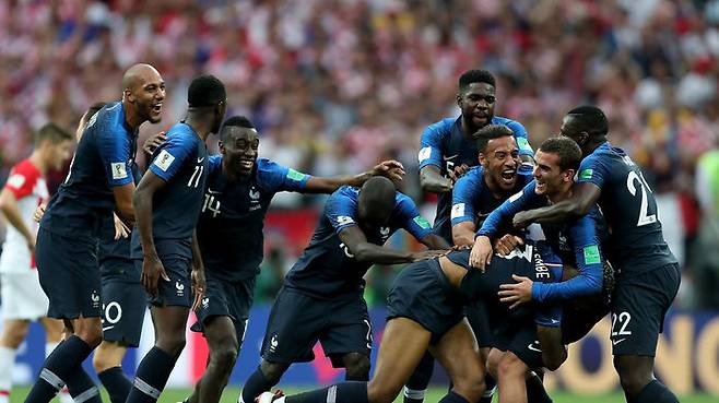 15일 오후(현지시간) 러시아 루즈니키 스타디움에서 열린 2018 러시아 월드컵 결승전 경기 종료 후 프랑스 선수들이 기뻐하고 있다.
