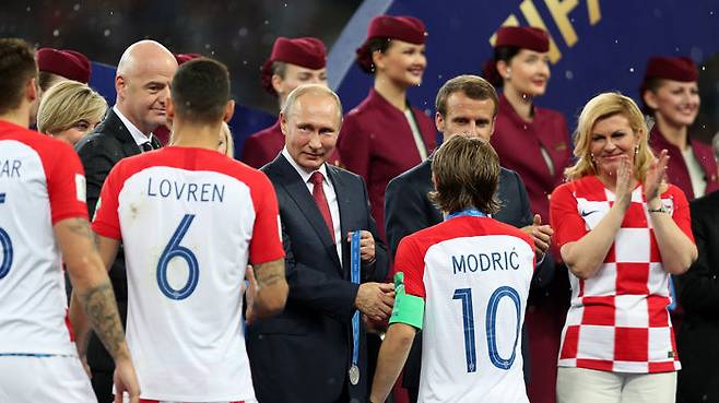 15일 오후(현지시간) 러시아 루즈니키 스타디움에서 열린 2018 러시아 월드컵 결승전 종료 후 크로아티아 선수들이 준우승 메달을 수여받고 있다.