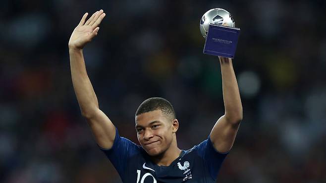 15일 오후(현지시간) 러시아 루즈니키 스타디움에서 열린 2018 러시아 월드컵 결승전 종료 후 킬리안 음바페가 영플레이어상을 수상하고 기뻐하고 있다.