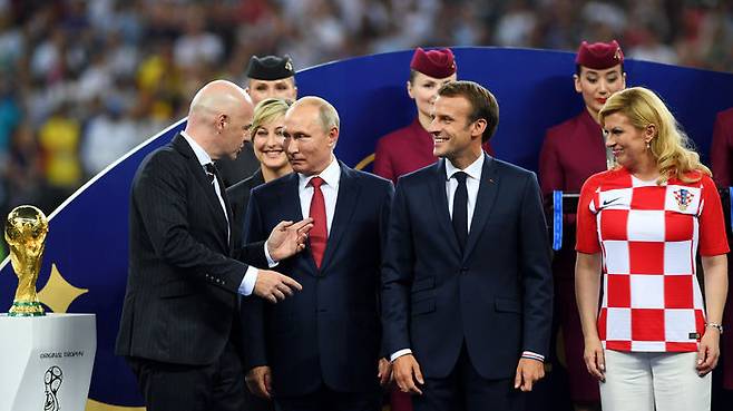 15일 오후(현지시간) 러시아 루즈니키 스타디움에서 열린 2018 러시아 월드컵 결승전 종료 후 지아니 인판티노(좌 부터), 블라디미르 푸틴, 에마뉘엘 마크롱, 콜린다 그라바르 키타로비치가 수상을 준비하고 있다.