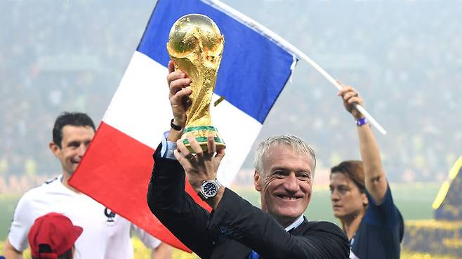 15일 오후(현지시간) 러시아 루즈니키 스타디움에서 열린 2018 러시아 월드컵 결승전 종료 후 디디에 데샹 감독이 트로피를 들어올리고 있다.