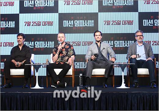 [마이데일리 = 한혁승 기자] 할리우드 스타 톰 크루즈, 사이먼 페그, 헨리 카빌, 크리스토퍼 맥쿼리 감독(왼쪽부터)이 16일 오후 서울 잠실 롯데 호텔월드에서 진행된 영화 '미션 임파서블:폴아웃' 기자간담회에 참석했다.