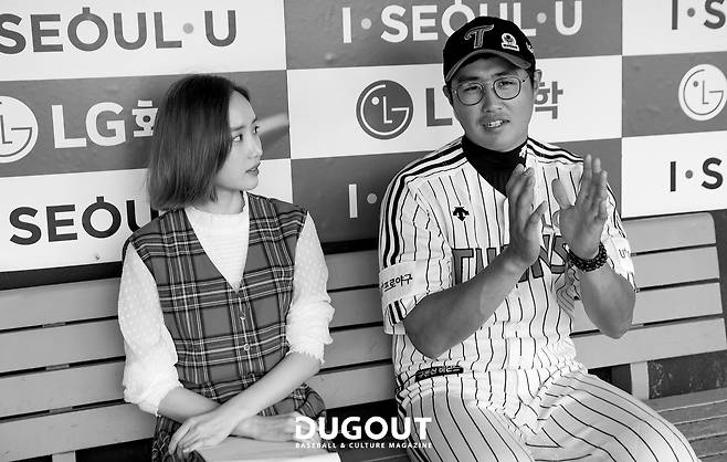 안녕하세요. <더그아웃 매거진> 독자 여러분, 아나운서 윤태진입니다. 그간 잘 지내셨어요? 인터뷰가 있기 며칠 전, 시즌 내내 좋은 모습을 보였던 채은성 선수가 돌연 경기 엔트리에서 빠졌어요. 그 이후 바로 포함됐지만, 만날 날을 앞두고 있던 터였기에 내심 걱정이 많이 됐답니다. 그런 제 걱정이 무색하게도 더그아웃에 들어서는 채은성 선수의 얼굴이 밝아 안심이었어요. 그래도 인사 겸 안부를 묻자 호탕한 웃음으로 답해주었어요.