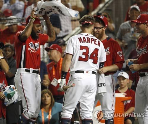 epa06894081 National League Bryce Harper of the Washington Nationals (C) gets cooled off while taking a time-out at his bat during the All-Star T-Mobile Home Run Derby at Nationals Park in Washington, DC, USA, 16 July 2018. EPA/JIM LO SCALZO