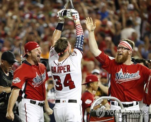 epa06894100 National League Bryce Harper of the Washington Nationals (C) holds up the trophy after winning home run ball during the All-Star T-Mobile Home Run Derby as teammates, Sean Doolittle (R) and Max Scherzer (L) cheer on at Nationals Park in Washington, DC, USA, 16 July 2018. EPA/JIM LO SCALZO