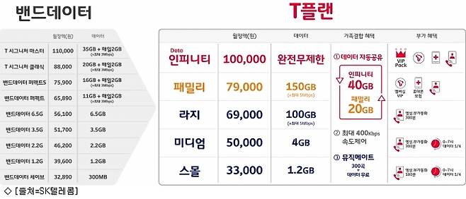 T플랜은 ▲스몰 ▲미디엄 ▲라지 ▲패밀리 ▲데이터인피니티 등 5종이다. 기존 밴드데이터 9종 대비 요금제 명칭과 개수를 간소화했다. 모든 구간의 기본 데이터 제공량을 확대했으며 이동전화·집전화 음성과 문자를 기본 제공한다.