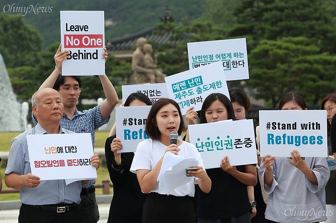 | ▲ "혐오가 아니라 지지와 연대를" 12일 오후 청와대앞 분수대광장에서 '제주 예멘 난민에게 혐오가 아니라, 지지와 연대를 보내는 이주인권노동단체 기자회견'이 이주노동자공대위, 난민네트워크, 제주난민인권을위한범도민위원회 등 시민단체 회원들이 참석한 가운데 열렸다. |
