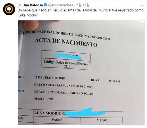 이 아이는 루카 모드리치라는 이름을 가진 첫 페루인이 됐다.