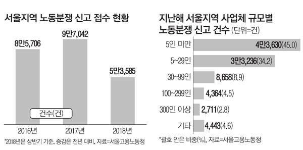 19일 서울고용노동청에 따르면 서울 지역 노동분쟁 신고 건수는 올해 6월 기준 5만3585건으로 지난해 대비 10%이상 늘었다. 지난해 역시 총 신고 건수가 9만7042건에 달해 2016년 대비 13.2% 늘었다. 특히 지난해 신고건 중 7만6866건이 30인 미만 영세 사업장에서 발생했다. 이들 분규 중 대다수가 근로계약서 미작성, 퇴직금 등 임금 미지급 때문에 벌어졌다. 사업주 잘못인 것은 분명하지만, 사업주가 노동법을 세세히 알지 못하는 점을 역으로 악용해 돈을 타내는 '얌체 근무자'도 있다는 전언이다.