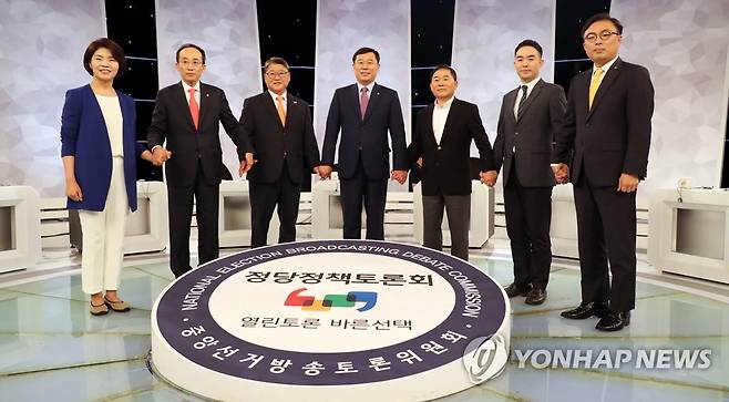 (서울=연합뉴스) 최재구 기자 = 20일 서울 여의도 KBS 본관에서 열린 제1회 정당정책토론회에서 각 당의 참석자들이 손을 잡고 포토타임을 갖고 있다. 왼쪽부터 더불어민주당 한정애, 자유한국당 추경호, 대한애국당 조원진, 민중당 김종훈, 민주평화당 황주홍, 바른미래당 채이배, 정의당 신장식. 2018.7.20