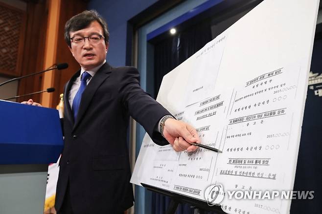 (서울=연합뉴스) 황광모 기자 = 김의겸 청와대 대변인이 20일 오후 청와대 춘추관에서 '계엄령 문건'의 세부자료를 공개하고 있다. 청와대는 국방부에서 취합된 '계엄령 문건'을 19일 제출받아 문재인 대통령의 지시로 이날 일부 자료를 공개한 것이다. 2018.7.20