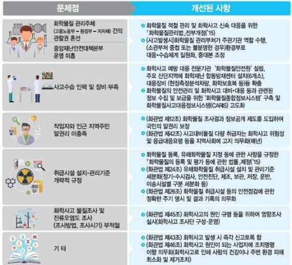 이후 정부는 화학물질과 관련된 사고에 신속하게 대응할 수 있도록 관련 전담기구를 신설, 화학공장이 밀집된 6개 주요 산업단지에 합동방재센터를 설치해 운영하는 등 국내 화학물질사고에 대한 철저한 대응태세를 갖춰 나가고 있다.