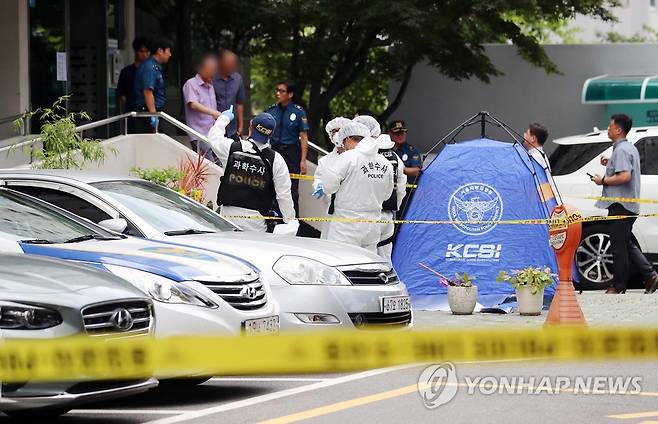 투신장소인 서울 중구 한 아파트에서 경찰 관계자들이 사건 경위를 조사하고 있다. 2018.7.23